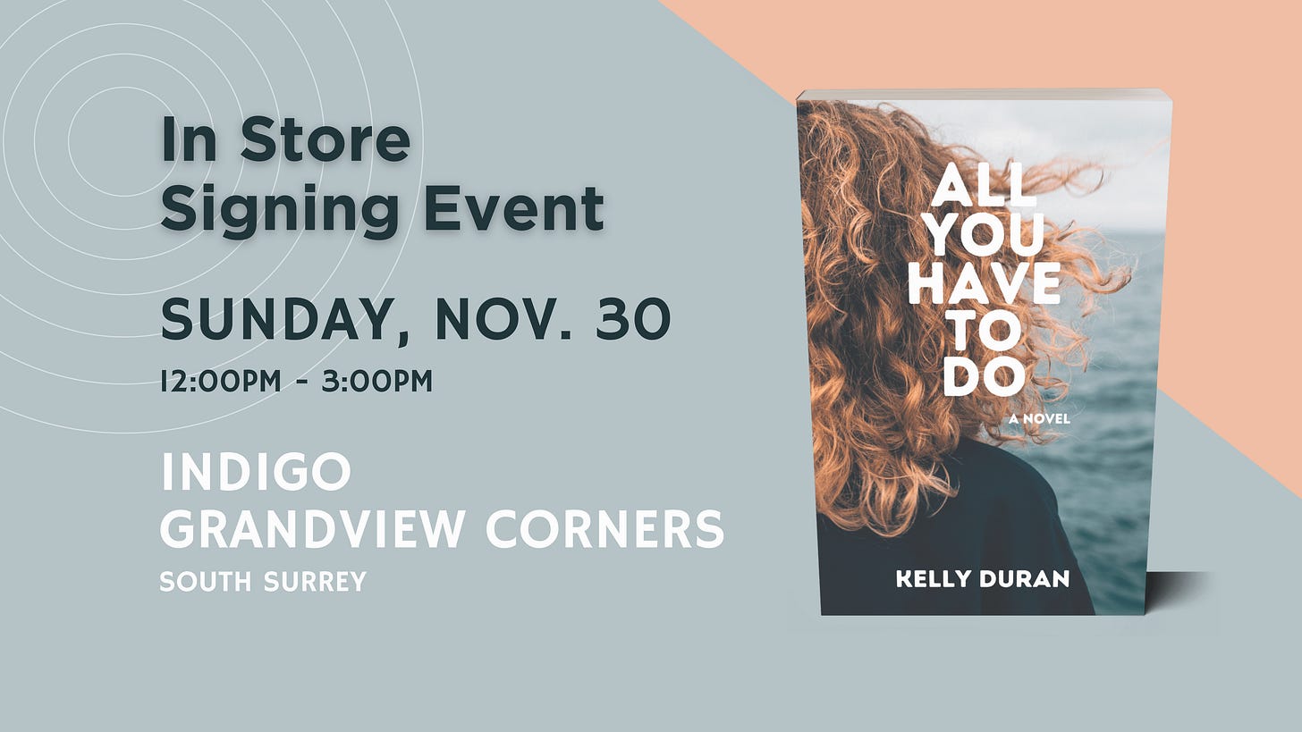 Which is why I’m so thrilled to share that I’ll be signing copies of All You Have To Do at Indigo Grandview Corners in South Surrey on Sunday, November 30 from 12–3pm.